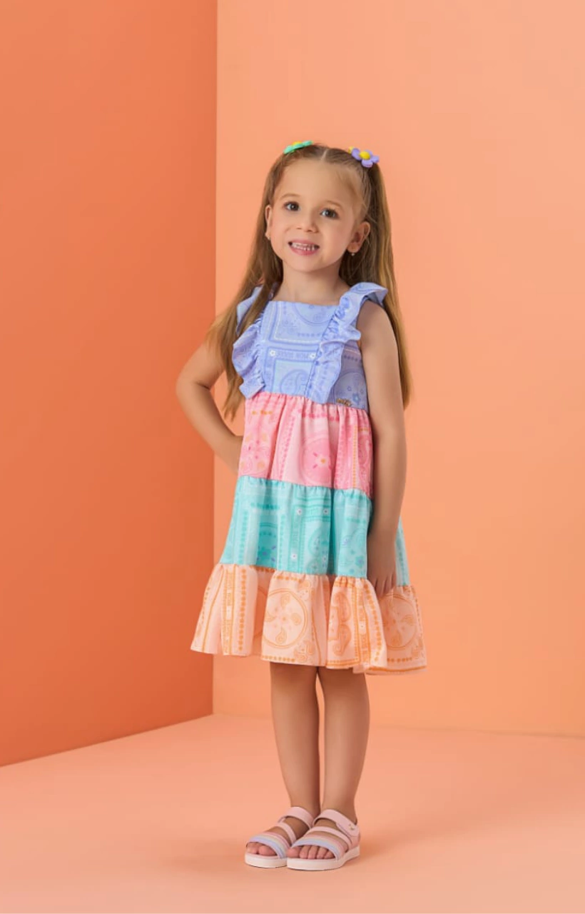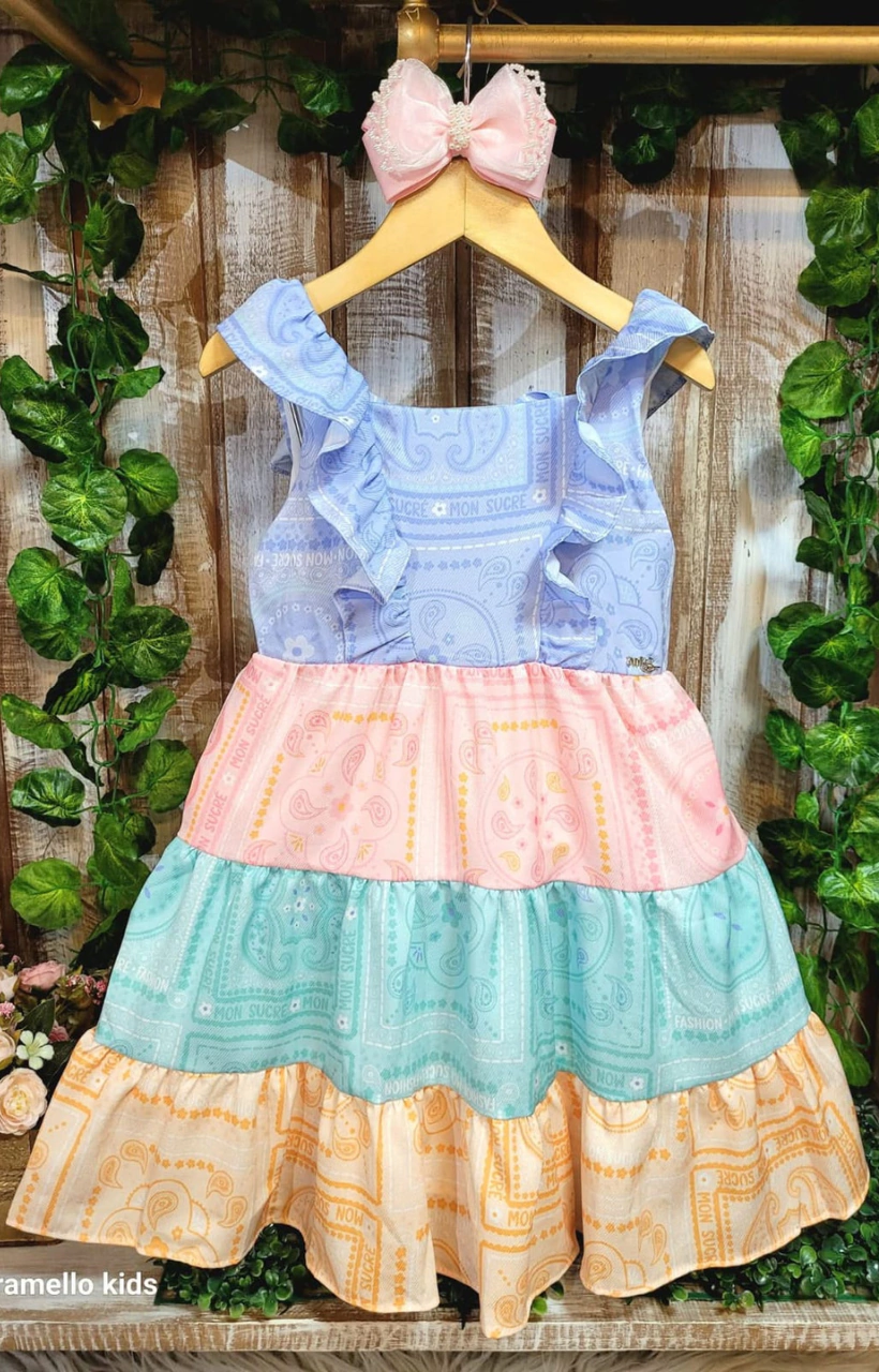 Encante sua pequena com o nosso delicado e vibrante vestido da marca Mon Sucré, perfeito para ocasiões especiais. Com estampa colorida inspirada em bandana, detalhes de babadinho nas laterais e uma saia de camadas que traz movimento e alegria ao look. A gola com decote quadrado e as mangas regata de babadinho proporcionam um visual encantador e confortável, enquanto o laço nas costas adiciona um toque de fofura e charme. Confeccionado com materiais de alta qualidade, garante conforto e brilho à rotina das suas pequenas, transformando momentos especiais em memórias inesquecíveis. Surpreenda em cada detalhe e deixe sua filha ainda mais adorável para celebrar momentos únicos!